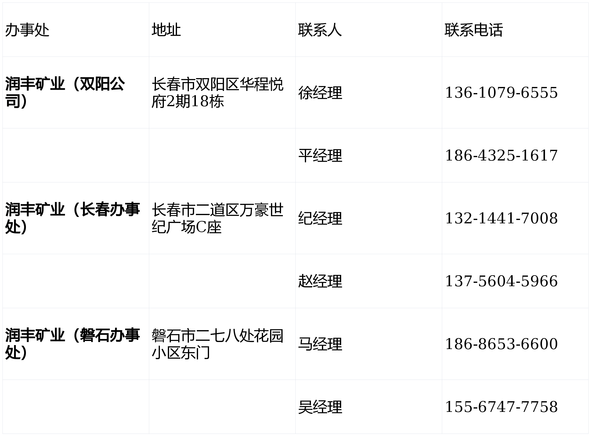 润丰矿业在东北地区设有多个办事处和联络点,为客户提供便捷的咨询、订货和售后服务: